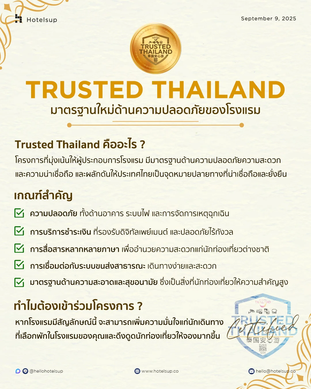 👉 นักเดินทางครั้งหน้าถ้าเจอสัญลักษณ์ “Trusted Thailand” ที่ไหน ลองเลือกพักดูสิครับ แล้วคุณจะมั่นใจได้ว่า “ทริปนี้ปลอดภัยและอุ่นใจยิ่งกว่าเดิม” 🌏✨